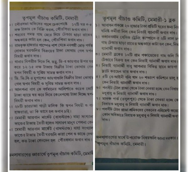 কোটি টাকার দুর্নীতি থেকে বালির খাদ ও টোল প্লাজার তোলাবাজি! মেমারিতে তৃণমূল বাঁচাও কমিটির পোস্টার ঘিরে তোলপাড়