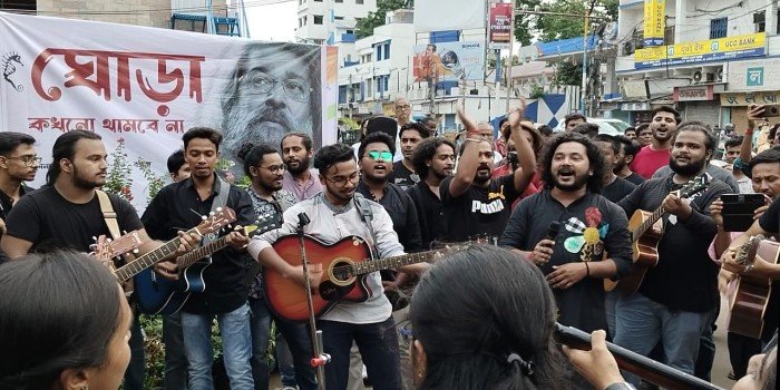 তন্ময় চট্টোপাধ্যায়,বর্ধমান: ‘পৃথিবীটা নাকি ছোট হতে হতে বোকা বাক্সতে বন্দী…. আ হা হা হা।’ রবিবার পড়ন্ত বিকেলে বর্ধমানের প্রাণকেন্দ্র কার্জন গেট চত্বরে এই কালজয়ী গান সমবেত ভাবে গেয়ে উঠলেন শিল্পীদের সাথে উপস্থিত অগুণিত শ্রোতৃবৃন্দও। উপলক্ষ্য ছিল ‘মহীনের ঘোড়াগুলি’ ব্যান্ডের শেষ ঘোড়া তাপস দাসের (বাপিদা নামে পরিচিত ছিলেন) স্মরণে এক অসাধারণ শ্রদ্ধার্ঘ্য নিবেদন।