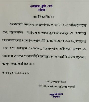 সৌরীশ দে, বর্ধমান: মধ্যপ্রাচ্যের অস্থির যুদ্ধকালীন পরিস্থিতির নেতিবাচক প্রভাব এবার সরাসরি অনুভূত হল পশ্চিমবঙ্গের আধ্যাত্মিক পরিমণ্ডলে। দেশের বিভিন্ন প্রান্তের একাধিক ধর্মীয় স্থানের পর এবার বর্ধমান শহরের অধিষ্ঠাত্রী দেবী মা সর্বমঙ্গলা মন্দিরের প্রাত্যহিক ভোগ প্রসাদ বিতরণের কর্মসূচি আগামীকাল থেকে অনির্দিষ্টকালের জন্য স্থগিত ঘোষণা করেছে মন্দির কর্তৃপক্ষ। মূলত ভোগ রান্নার অত্যাবশ্যকীয় উপাদান তথা বাণিজ্যিক গ্যাস সিলিন্ডারের অপ্রতুলতার কারণেই এই নজিরবিহীন সিদ্ধান্ত নিতে বাধ্য হয়েছে মন্দিরের ট্রাস্ট বোর্ড। আন্তর্জাতিক বাজারে জ্বালানি সংকটের জেরে স্থানীয় সরবরাহ ব্যবস্থা বিঘ্নিত হওয়ায় এই পরিস্থিতির সৃষ্টি হয়েছে বলে জানানো হয়েছে।