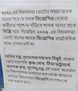 সামনেই বিজেপির ‘পরিবর্তন যাত্রা’ কর্মসূচি রয়েছে জেলায়। কিন্তু তার ঠিক পূর্বেই এই ধরনের পোস্টার এবং আদি বিজেপি কর্মীদের বিদ্রোহ দলের ভাবমূর্তিকে সংকটে ফেলেছে। বিক্ষুব্ধ কর্মীদের আশঙ্কা, হিন্দুত্ববাদী এবং আদর্শগত ভাবে স্বচ্ছ কর্মীদের দূরে সরিয়ে রাখার ফলে সংগঠন দিন দিন দুর্বল হচ্ছে। এর সরাসরি প্রভাব পরিবর্তন যাত্রার লোক সমাবেশের ওপর পড়তে পারে বলে মনে করা হচ্ছে। দলের দীর্ঘদিনের একনিষ্ঠ কর্মীরা মনে করছেন যে, বর্তমান নেতৃত্ব যদি তাদের সঠিক মর্যাদা না দেয় এবং অভিযুক্তদের বিরুদ্ধে ব্যবস্থা না নেওয়া হয়, তবে আগামী বিধানসভা নির্বাচনে তার ফল ভোগ করতে হবে। তৃণমূল কংগ্রেসের বিরুদ্ধে লড়াই করার পরিবর্তে এই অভ্যন্তরীণ অন্তর্কলহ দলেরই বেশি ক্ষতি করছে বলে রাজনৈতিক পর্যবেক্ষকদের ধারণা।