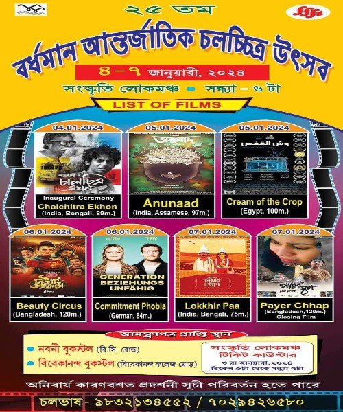 এবার একটি অসমীয়া ছবির পাশাপাশি দুটি বাংলাদেশের সিনেমাও দেখানো হবে। এছাড়াও ইজিপ্ট এবং জার্মান ছবিও থাকবে এবারের চলচ্চিত্র উৎসবে। বর্ধমান চলচিত্র চর্চা কেন্দ্রের সম্পাদক বাপ্পাদিত্য দাঁ বলেন, উৎসবের আমন্ত্রণপত্র আগের দিন বিকাল থেকে সন্ধ্যা পর্যন্ত সংস্কৃতি লোকমঞ্চের কাউন্টার থেকেই দেওয়া হবে। পাশাপাশি, শহরের দুটি বুক স্টল থেকেও আমন্ত্রণপত্র পাওয়া যাচ্ছে।