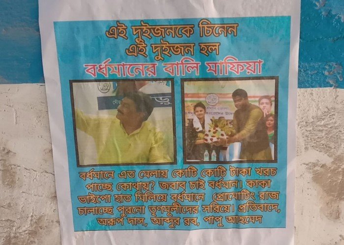 কিন্তু বেশিরভাগ ক্ষেত্রেই এই সমস্ত পোস্টার দেওয়ার পিছনে কে বা কারা রয়েছে তা নিয়ে রাজনৈতিক মতবিরোধ থাকলেও নির্দিষ্ট করে জানা যেতো না এই কাজ কাদের। এবার বর্ধমান শহরের ৭ ও ৮ নম্বর ওয়ার্ডের একাধিক জায়গায় খোদ বর্ধমান দক্ষিণ কেন্দ্রের বিধায়ক খোকন দাস ও পূর্ব বর্ধমান জেলা তৃণমূলের যুব সভাপতি রাসবিহারী হালদার কে ‘ বালি মাফিয়া ‘ তকমা দিয়ে ছবি দেওয়া রঙিন পোস্টার দেওয়া কে ঘিরে তুমুল আলোড়ন ছড়িয়েছে। চাঞ্চল্যকর ভাবে এই পোষ্টারের নিচে বর্ধমান শহরের তিন তিনজন তৃণমূল নেতারও নাম উল্লেখ করা রয়েছে। আর এই ঘটনায় এবার পোস্টার রাজনীতি অন্য মাত্রা পেল বলেই মনে করছেন ওয়াকিবহাল মহল।