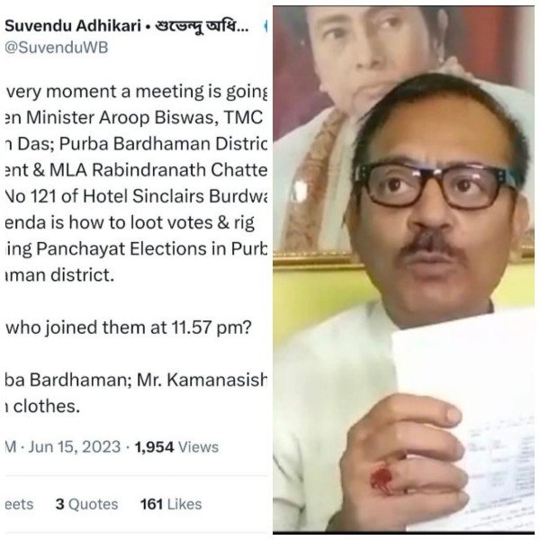 উল্লেখ্য, গতকাল রাত প্রায় সাড়ে ১২টায় শুভেন্দু অধিকারী টুইট করে জানান, বর্ধমানের জাতীয় সড়কের ধারে একটি বিলাসবহুল হোটেলের ১২১ নম্বর রুমে আসন্ন পঞ্চায়েত ভোট কিভাবে লুট করা যায় ও রিগিং পদ্ধতি কি হবে সেই নিয়ে মন্ত্রী অরূপ বিশ্বাসের নেতৃত্বে বৈঠক হয়। সেখানে উপস্থিত ছিলেন বর্ধমান দক্ষিণের বিধায়ক খোকন দাস, বিধায়ক তথা জেলা তৃণমূল কংগ্রেসের সভাপতি রবীন্দ্রনাথ চট্টোপাধ্যায়। টুইটে শুভেন্দু অধিকারী অভিযোগ করেন যে, সাদা পোশাকে সেখানে জেলা পুলিশ সুপার কামনাশীষ সেনও উপস্থিত ছিলেন। বৈঠকে পরিকল্পনা হয়, পঞ্চায়েত ভোটে কিভাবে ভোট লুঠ ও রিগিং করা হবে বলে টুইটে দাবী করেন বিরোধী দলনেতা।