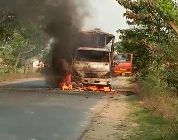 খন্ডঘোষে লরির সঙ্গে মুখোমুখি সংঘর্ষ রেসিং বাইকের, সংঘর্ষে আগুন লেগে ভস্মীভূত লরি ও বাইক, অল্পের জন্য রক্ষা বাইক চালকের