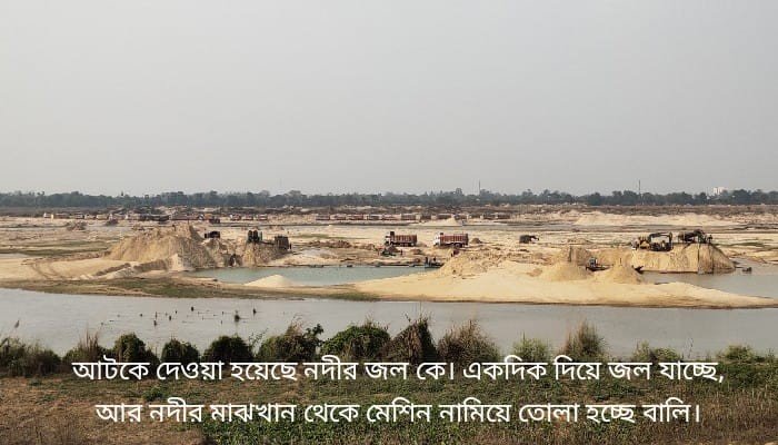 এমনও দেখা যাচ্ছে যে এই বালি নদীর যে অংশ থেকে তোলা হচ্ছে সেই জায়গায় যাতে নদীর জল স্বাভাবিক ভাবে আসতে না পারে তার জন্য অনেক আগে থেকেই নদীর গতিপথ কৃত্রিম ভাবে পরিবর্তন করে দেওয়া হয়েছে। তার জন্য বালি, মাটি দিয়ে নদীর একটা বড় অংশকে আটকে দেওয়া হয়েছে যাতে যে অংশ থেকে বালি তোলা হচ্ছে সেইদিকে জলের স্রোত না যেতে পারে। ফলে স্বাভাবিক ভাবেই নদীর গতিপথ বাধাপ্রাপ্ত হয়ে পরিবর্তন হয়ে যাচ্ছে। স্থানীয় গ্রামবাসীদের অভিযোগ, দিনের পর দিন এইভাবে বালি কেটে পাচার করার ফলে নদী গর্ভে বিশাল বিশাল গর্তের সৃষ্টি হচ্ছে। পরিবেশবিদদের মতে বর্ষার মরশুমে এইসব এলাকার আশপাশে বন্যার আশঙ্কার পাশাপাশি ইকো সিস্টেম নষ্টেরও আশঙ্কা তৈরি হচ্ছে।